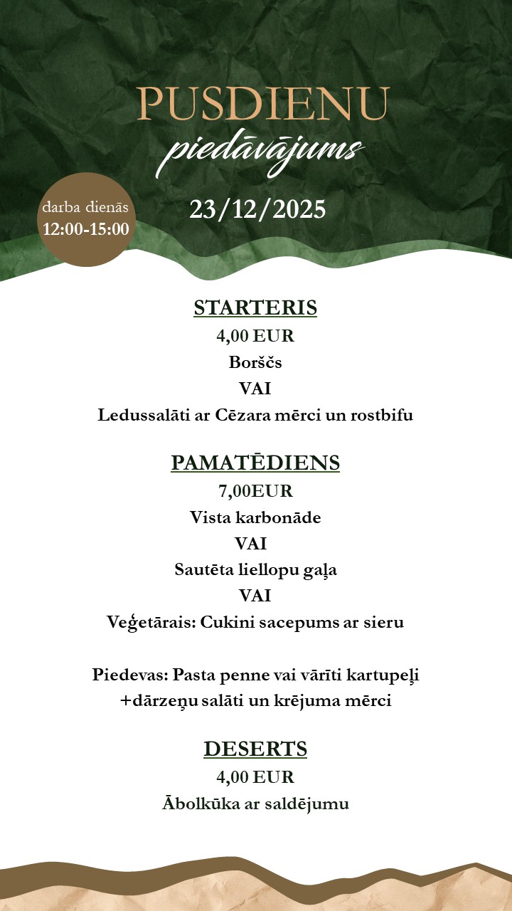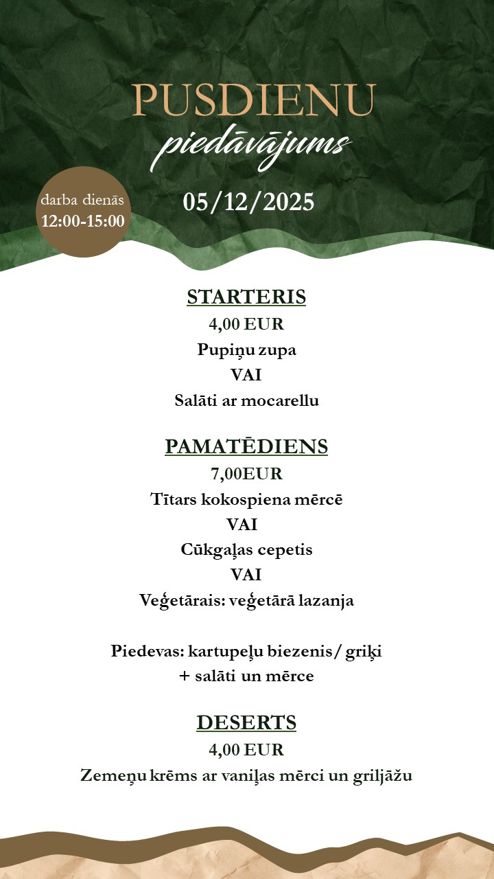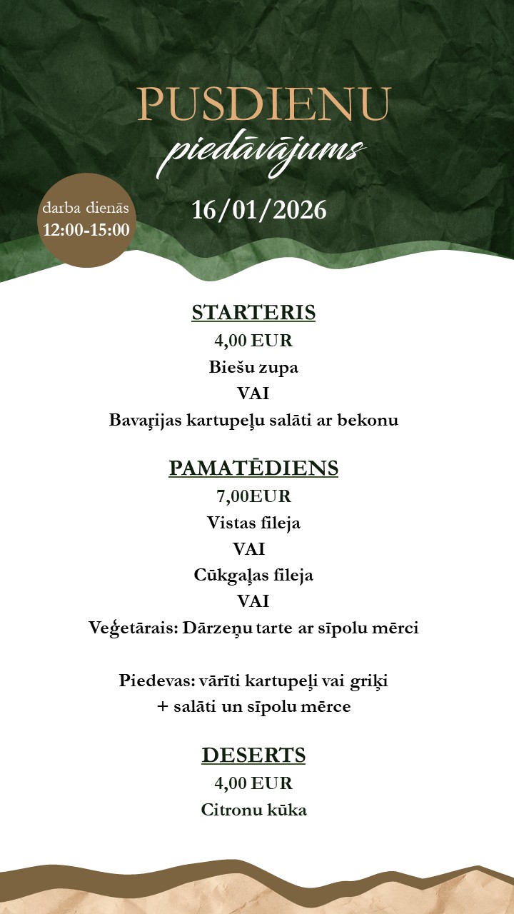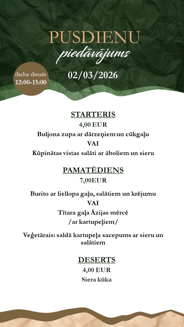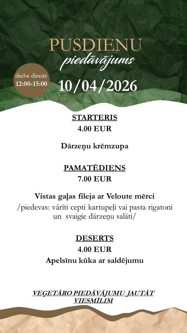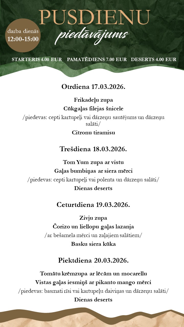 Restaurant menu available on-site or for takeaway . Orders by phone: +371 26165530