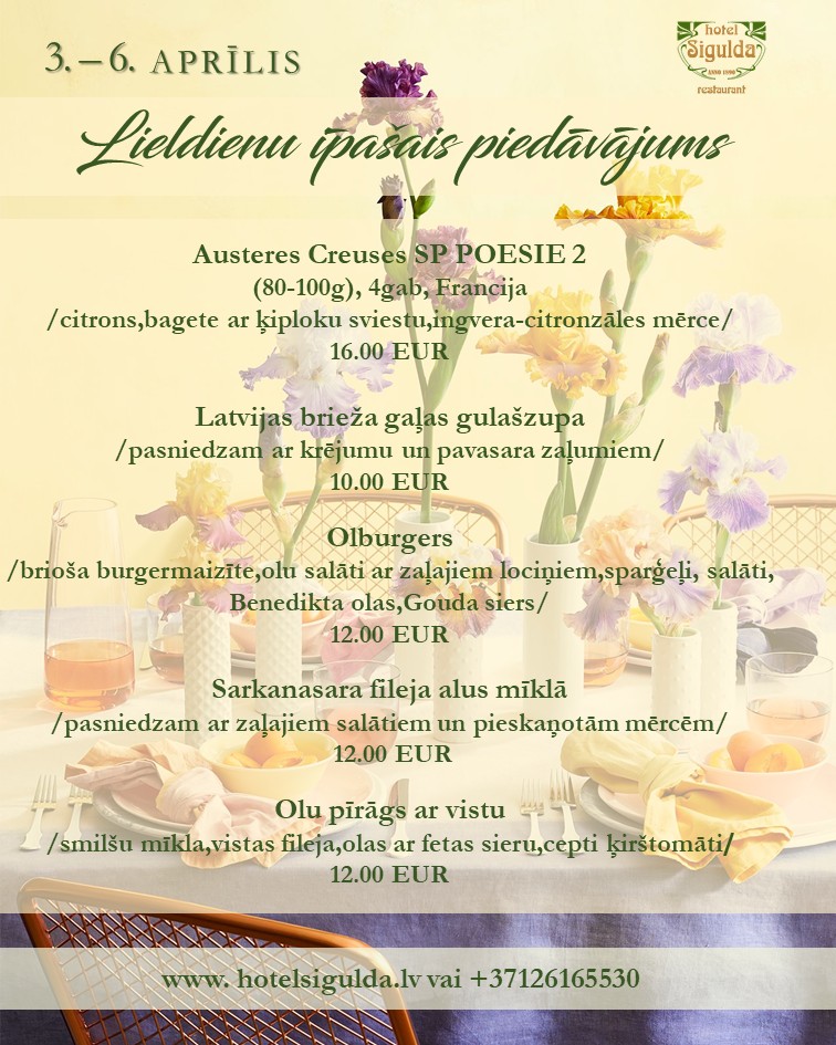 Reservations and individual orders can be arranged by phone +371 6797 2263 or e-mail: info@hotelsigulda.lv